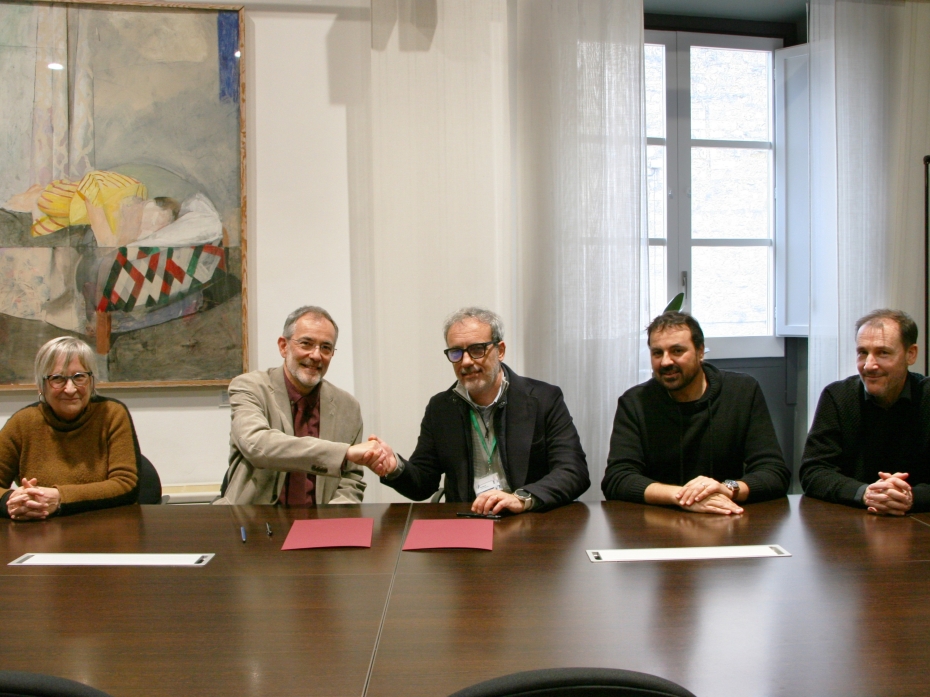 D’esquerra a dreta, la directora honorífica de la Càtedra, Pilar Monreal; el rector de la UdG, Josep Calbó; el director gerent de la Fundació Salut Empordà, Xavier Verdaguer; el director de la Càtedra, Oriol Turró, i el vicerector d’Impacte al Territori i Ambientalització, Ignasi Rodríguez-Roda